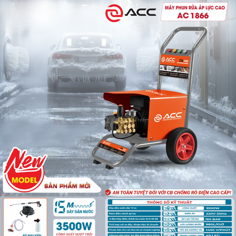 Máy rửa xe ACC AC1866 là dòng máy cao cấp thuộc phân khúc chuyên nghiệp của thương hiệu ACC, được thiết kế đặc biệt cho các tiệm rửa xe, gara, đơn vị vệ sinh công nghiệp và người dùng có nhu cầu sử dụng liên tục, cường độ cao. Với công suất 3500W, áp lực làm việc 160 Bar và động cơ cảm ứng từ siêu bền, model AC1866 mang đến khả năng phun rửa mạnh mẽ, ổn định và tiết kiệm thời gian đáng kể.
